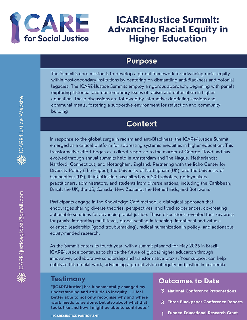 ICARE4Justice brings together a group of transnational critical scholar-practitioners to analyze, assess and design important considerations for establishing a global strategy and framework for advancing equity for racially and ethnically minoritized communities in education research, praxis and policy.